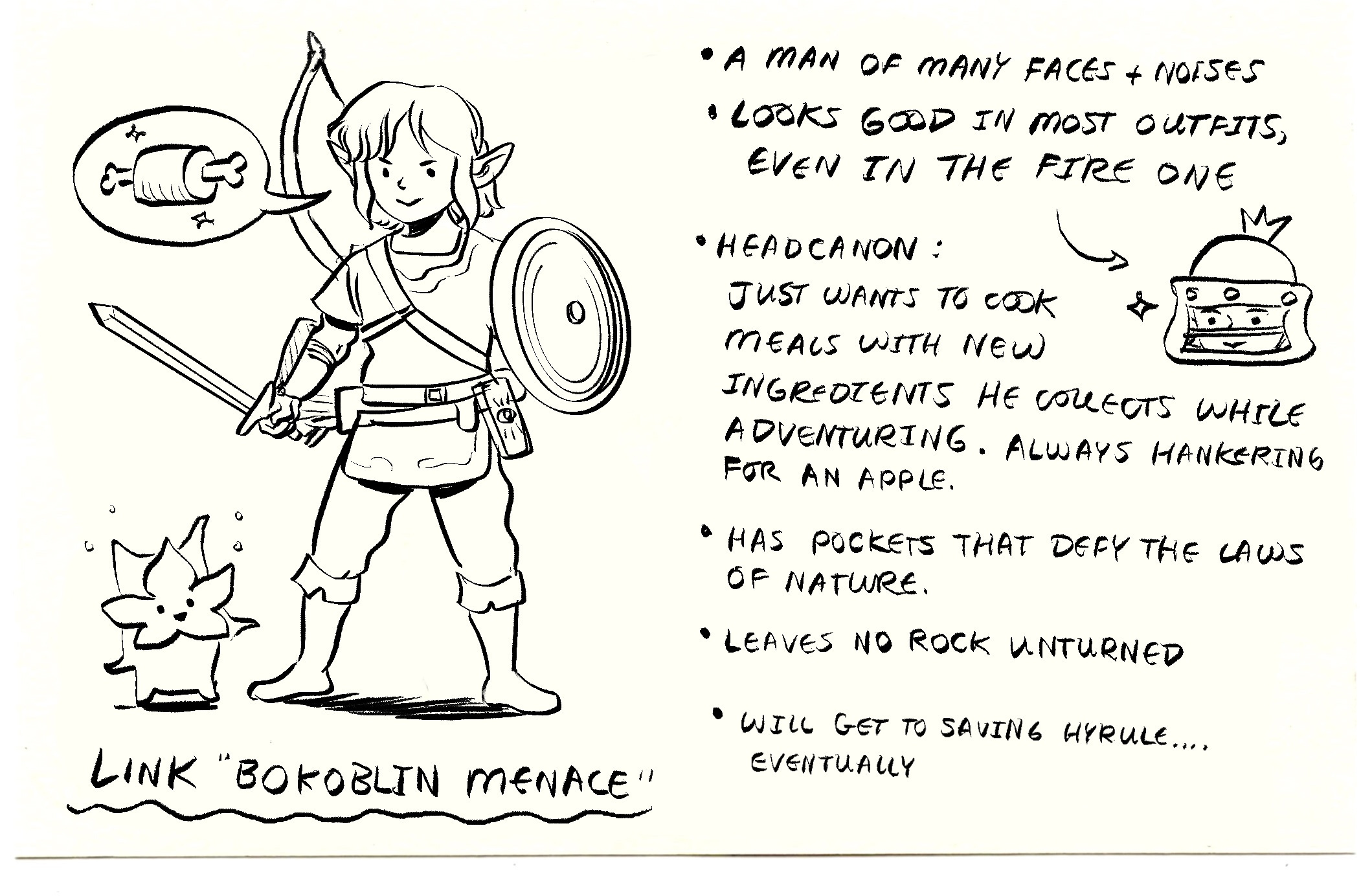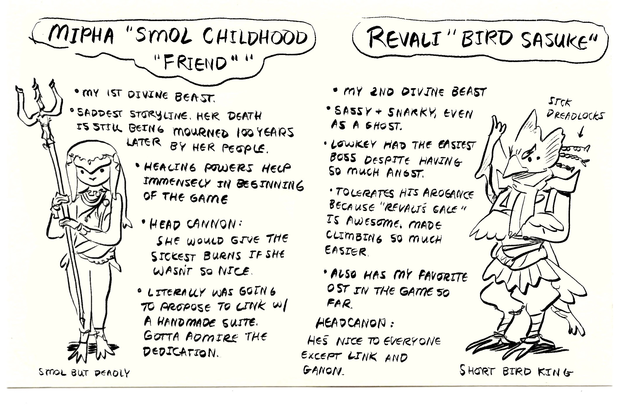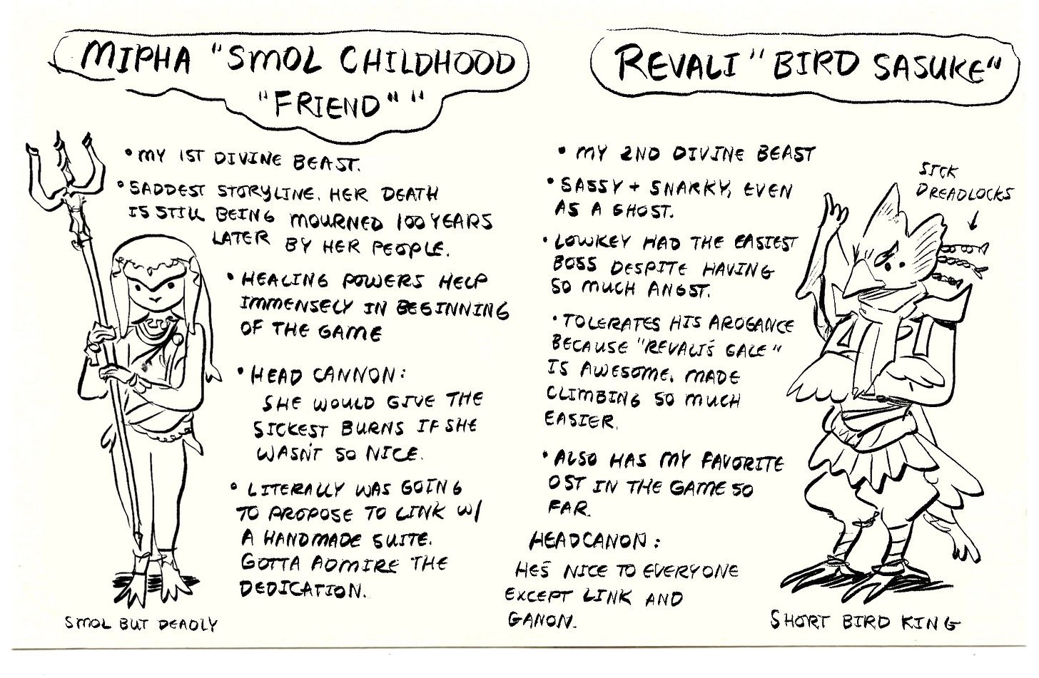 I find myself wandering, taking in all the shrines and korok seeds along the way. It’s almost a miracle I’ve been able to complete parts of the plot with all the time I’ve spent just cooking meals, fighting monsters, and taking pictures of the local fauna. It’s almost like fantastical glamping haha. Before I end this post and go back to nap, here are some little doodles of how I’ve been feeling about the game thus far.